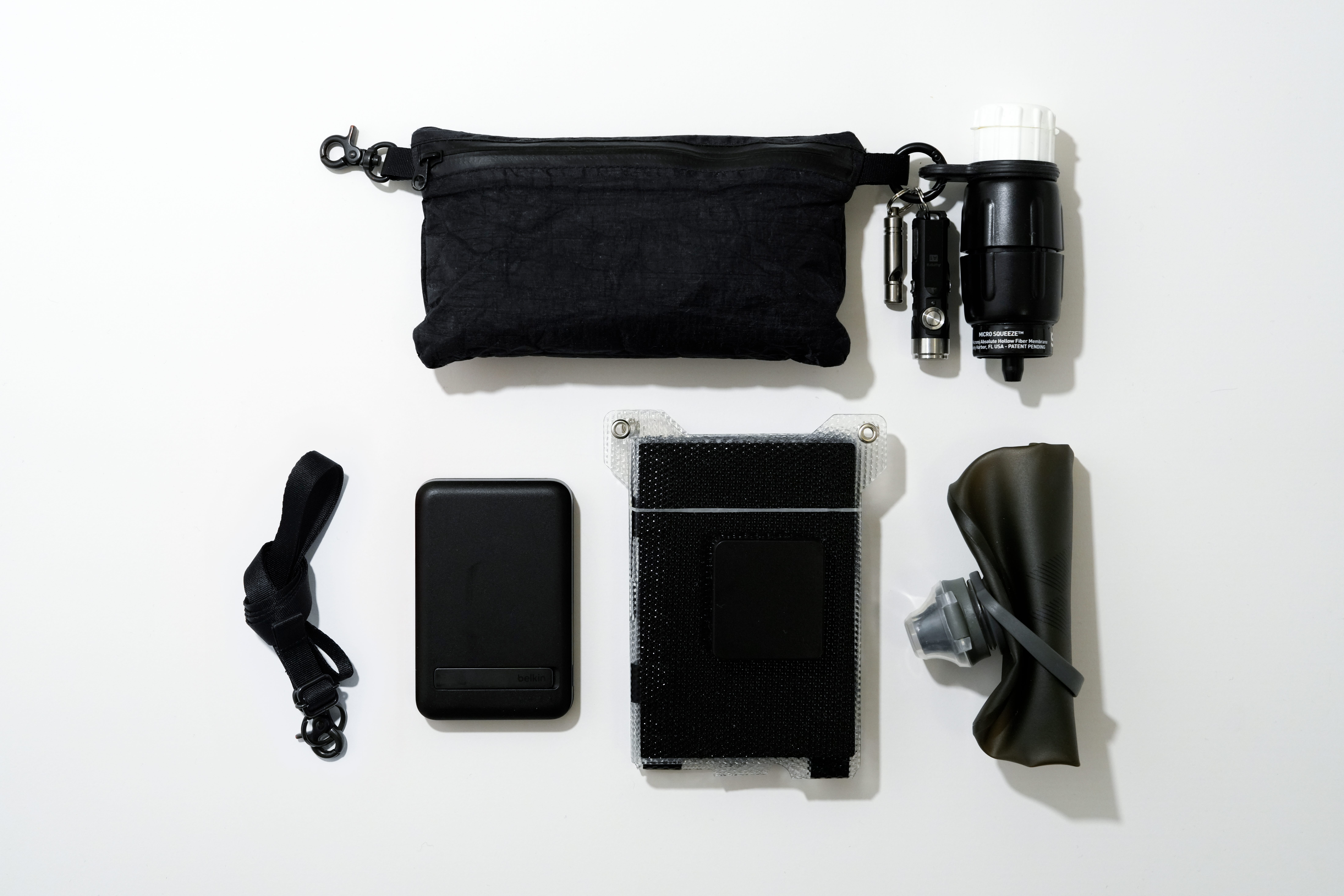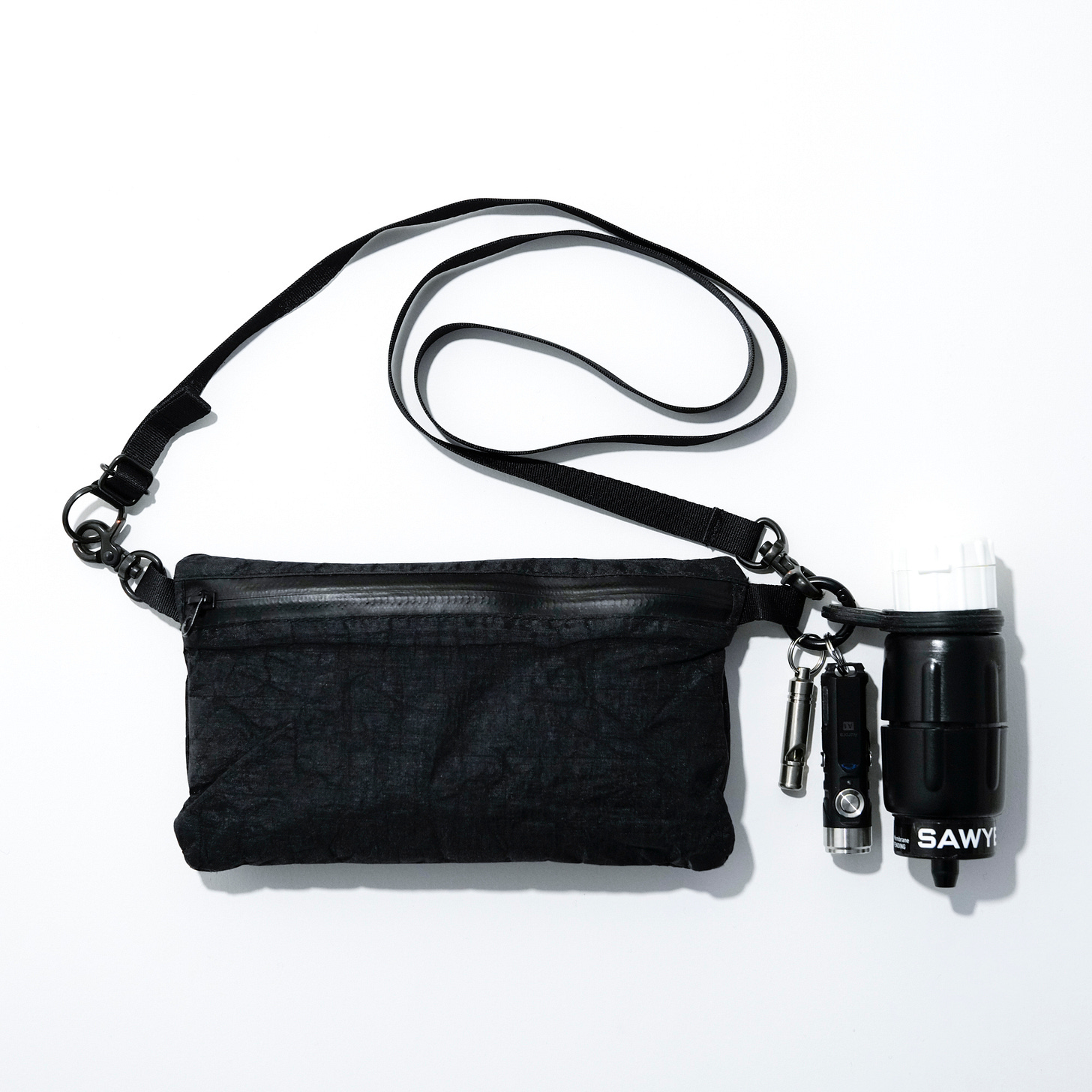 普段から災害時の備えとして、高城剛氏による『NEXTRAVELER TOOLS』のダイニーマ製エマージェンシーポーチに、最低限のエマージェンシーグッズをまとめてバッグに常備しています。外にはホイッスル、小型LEDライト、小型浄水器を取り付けています。