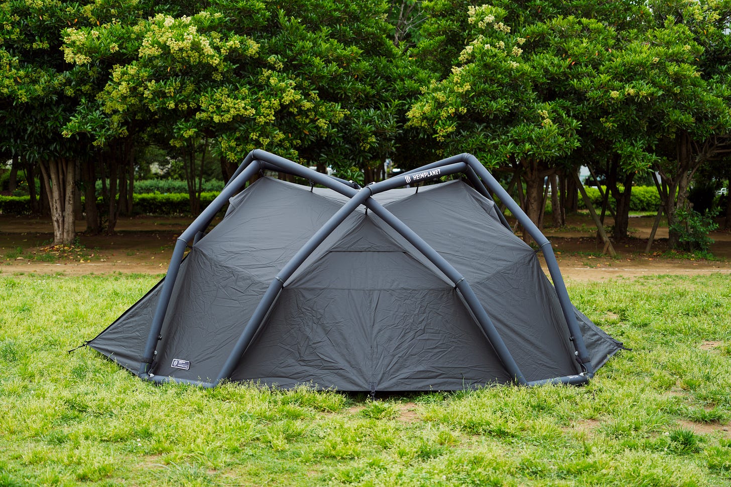 最近ファミリーキャンプ用に使い始めた、エアフレームテントでお馴染み『Heimplanet』の4人用テント『Backdoor, 4-Season』のフルブラックモデル。ジオデシックデザインが近未来的でカッコ良く、テントを広げて専用ポンプでフレームを膨らませるだけで簡単に設営可能。必要とするペグの本数も少なく、撤収も空気を抜くだけであっという間に完了します。