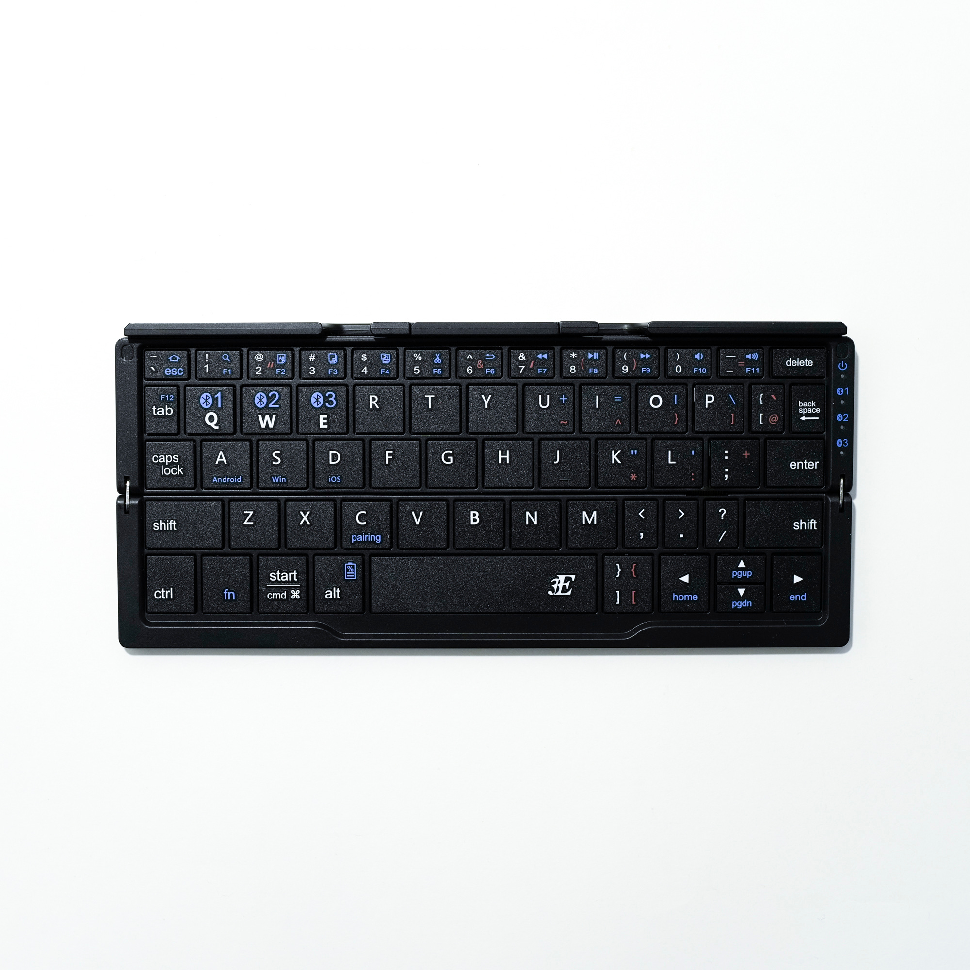 背面にスマートフォンスタンドを内蔵した二つ折りの縦開きタイプのキーボード。金属製の筐体で折りたためばペンケースサイズになり、マルチペアリング対応で、3台のデバイスを簡単に切替え可能です。この手のキーボードに多い三つ折りの横開きタイプと比べて剛性が高いので、コンパクトなサイズながら快適に打鍵することができます。