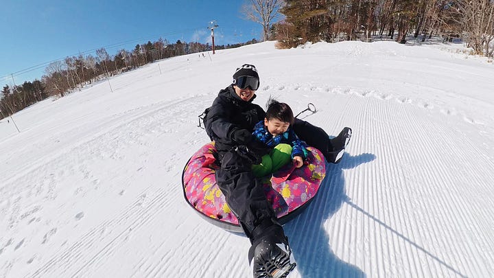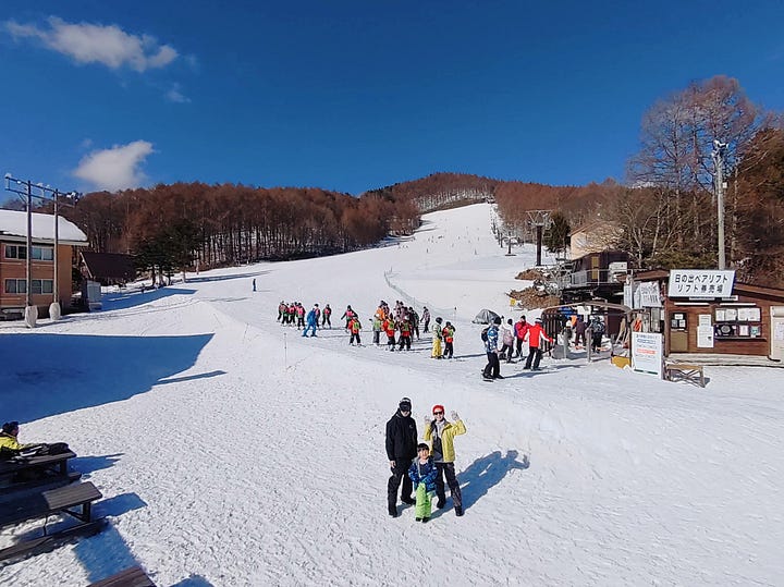 滞在中はスノーボードをしに家族で『菅平高原スノーリゾート』まで足を伸ばしました。滞在した拠点の周囲や街中にはほとんど雪がなかったため心配していましたが、山を登るにつれてどんどん雪が増えていき、ゲレンデにはバッチリ雪が積もっていました。