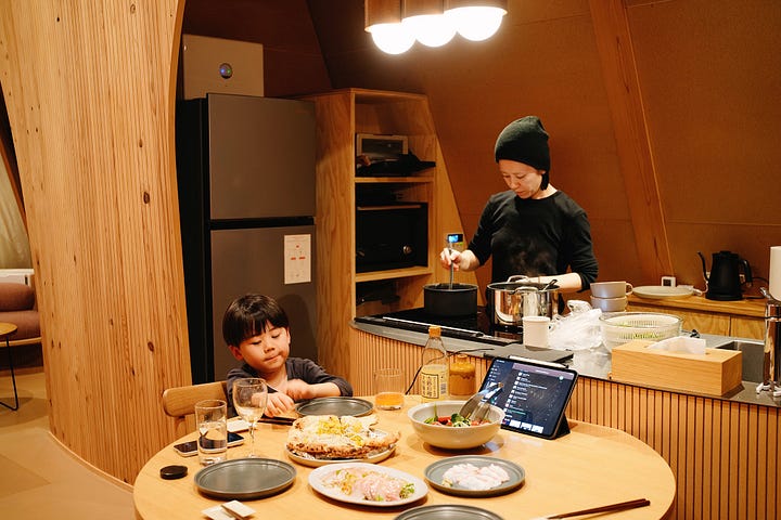今回も向かう途中に馴染みのベーカリーやローカルスーパーに立ち寄って新鮮な食材を買い込み、備え付けのキッチンで夕食の準備。少しリモートワークをした後、家族でテーブルを囲んでゆっくりと食事を楽しみました。平日は仕事が忙しくて家族揃って夕食がとることができないので、ボクにとってはそれだけで最高に贅沢な時間です。