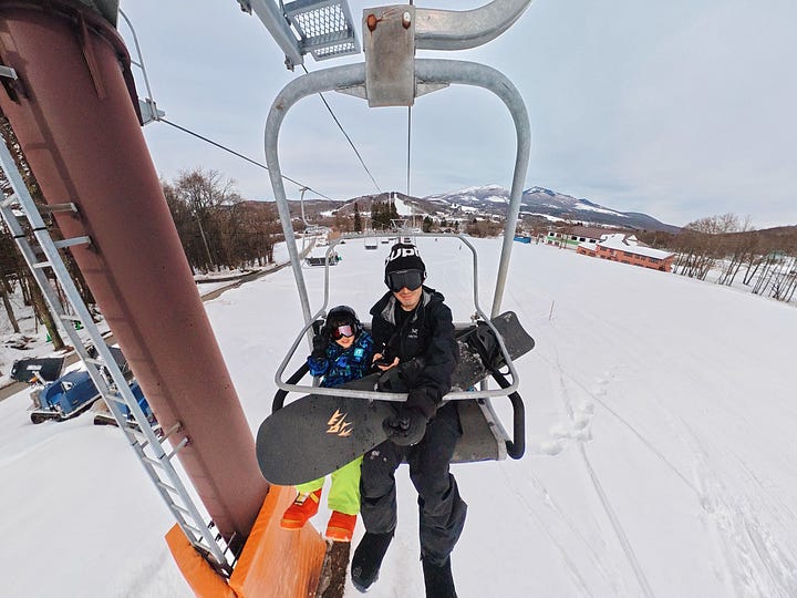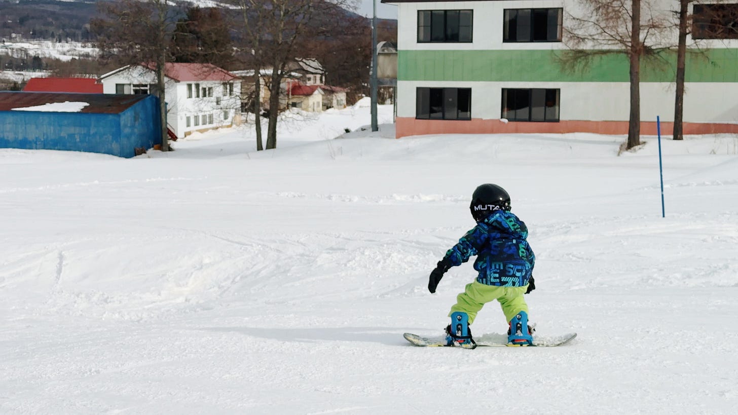 そして遂に子供がスノーボードデビューしました。当初は予定していなかったんですが、本人がやってみたいということで、最終日の早朝にスノーボードスクールを予約して必要な道具一式をレンタル。 90分かけて先生から基本を教わった後、緩やかなファミリーコースを一緒に滑ったんですが、一度も転ばずに1分以上も滑り続けてビックリ。子供のスポンジのような吸収力を目の当たりにして、改めてその可能性の高さに驚かされましたね。