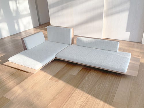 ミニマルなデザインのローソファ。床で暮らす和モダンスタイルでいいですね。