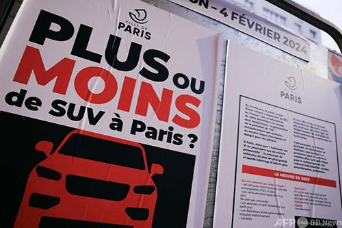 パリ中心部でSUVの駐車料金が3倍に値上げされることが住民投票で決定。重量1.6トンを超える車、車重2トン以上の電気自動車が対象とのこと。車体が大きくて重ければ当然環境負荷は高くなりますからね。