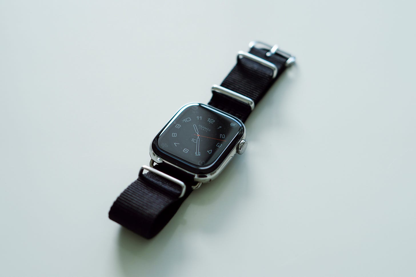 バンドは普段使い用に「Fragment Design」のNATOストラップ、ランニングやスポーツ用には面ファスナー式のナイロンバンドを装着して使い分けています。Apple Watchを使う前はロレックスのサブマリーナを愛用していたんですが、その頃からNATOストラップに交換していました。軽くて装着感が良いのはもちろんですが、無骨でカジュアルな雰囲気になるので気に入っています。金属製バンドは重い上に装着感がイマイチだし、革製バンドは装着感が良いとは言え汗や水濡れに弱いので問題外ですね。ちなみにセットになっていたエルメスのバンドは必要ないので妻にあげてしまいました。